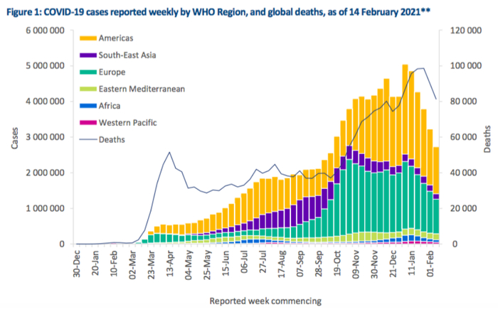 2、世界卫生组织2月16日发布每周流行病学更新(Weekly epidemiological update)称,全球报告新冠肺炎新增病例持续减少,上周新增270万病例,环比下降16%。新增死亡病例也环比下降10%。