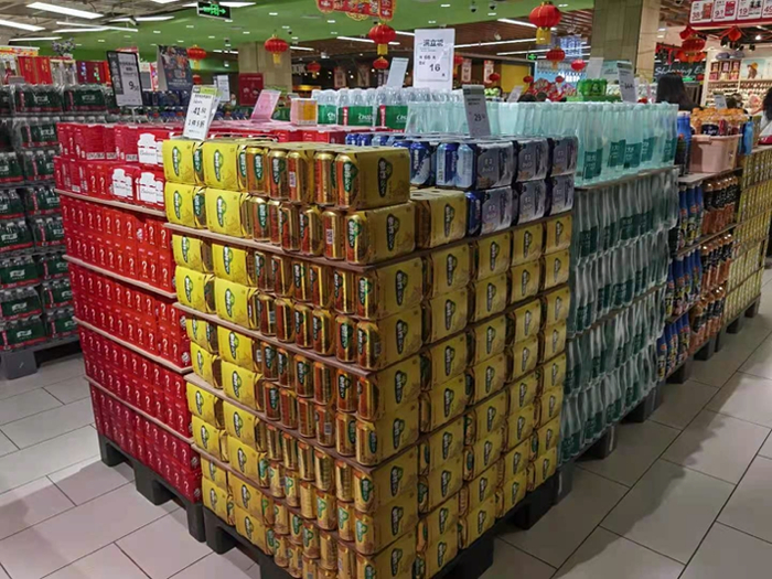 2、堆头摆放:百威啤酒有一个堆头,雪花有一个堆头。