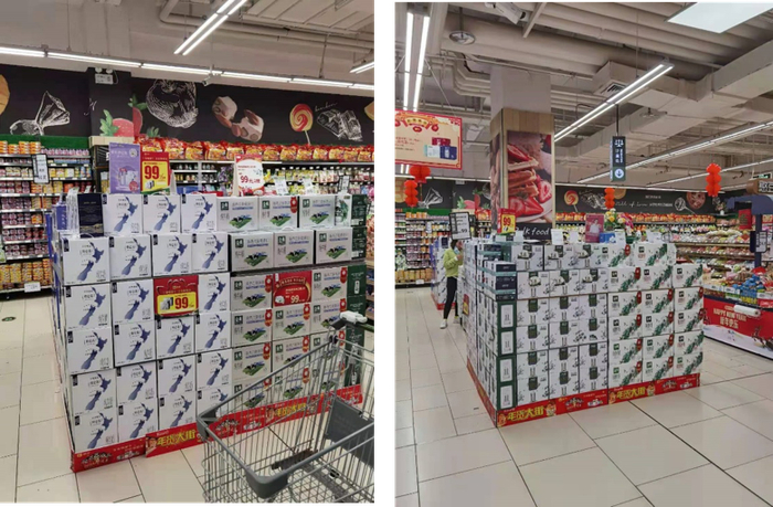 (4)堆头摆放:商超共2个大堆头,1个小堆头。两个大堆头分别为纯奶和常温酸奶,纯奶中金典和特仑苏各占一半,常温酸奶中安慕希和纯甄各占一半。小堆头以海外牛奶品牌为主。。