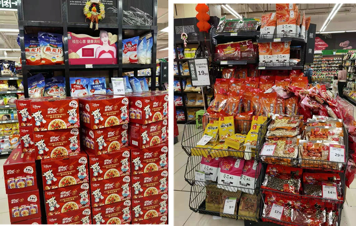 克明具有一个小堆头。春节期间有买一送一900g装8.9元,生产日期为2021.1。克明品牌货架占比约50%。