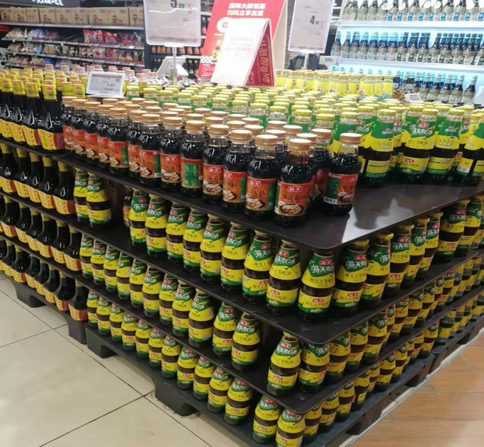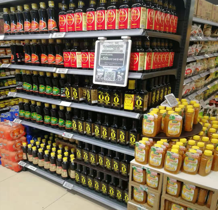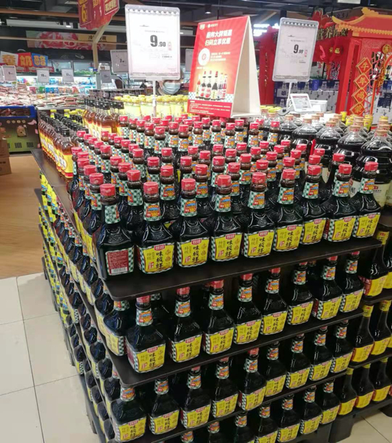 (2)货架摆放:酱油约5.5个货架,海天约占1.5个货架,厨邦约占0.5个货架,千禾约占1个货架,欣和六月鲜约占0.2个货架,太太乐约占1.2个货架。