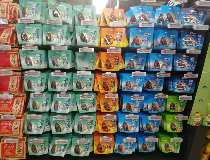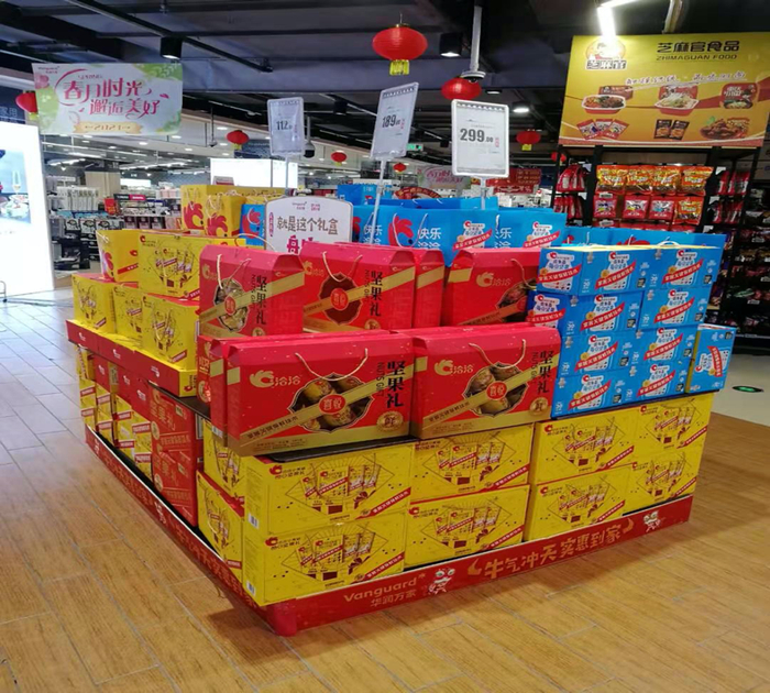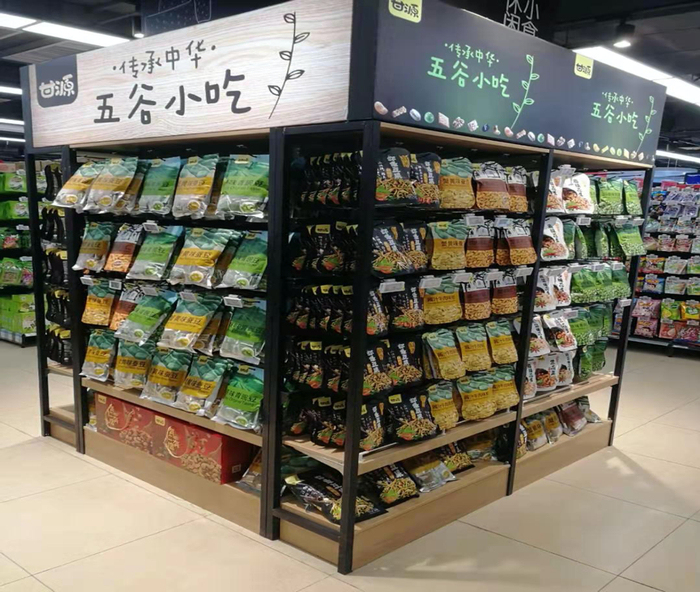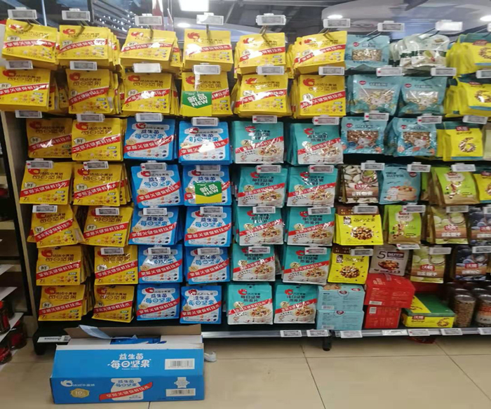 1. 商品陈列:有一个独立四面货架专门陈列甘源品牌的商品,在干果类商品区也有一个货架,此外还有散称区。