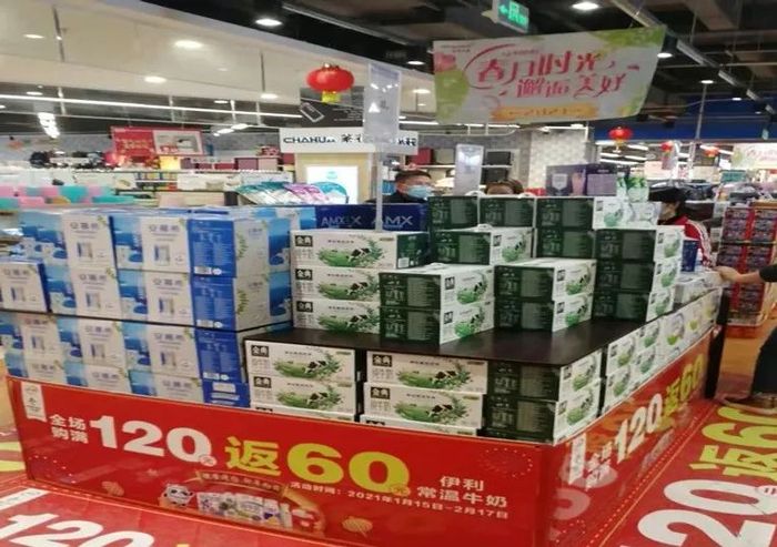 (4)堆头摆放:常温奶共11个堆头,其中伊利4个,陈列商品包括金典、安慕希、伊利纯牛奶、植选豆奶等;蒙牛3个,陈列商品包括纯甄、特仑苏、蒙牛臻享纯牛奶等;其他牛奶品牌堆头4个,包括庄园、雪顿、夏进等。
