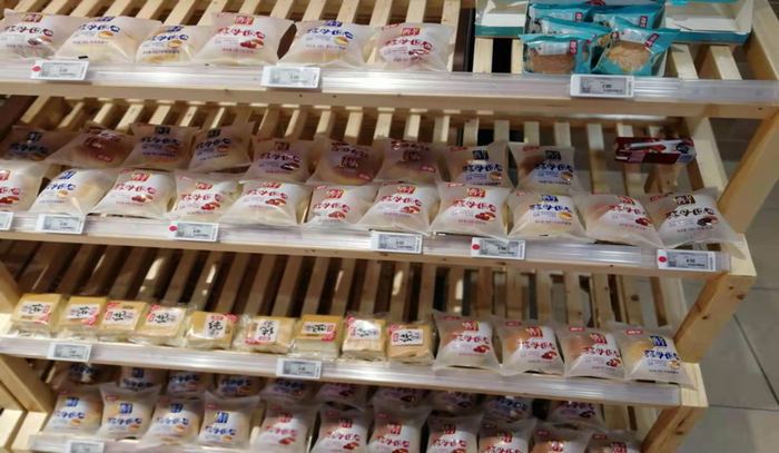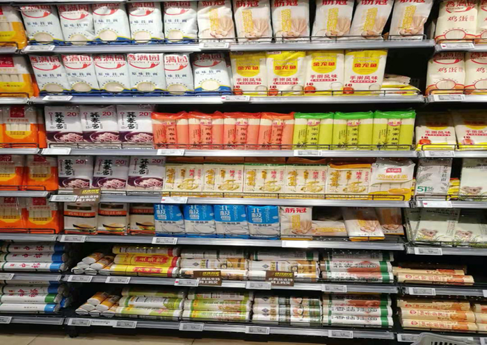 超市陈列:挂面区共5个货架,每个货架7层,克明挂面摆放在其中一个货架的最下面两层。