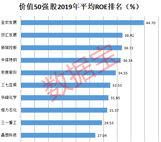 从盈利能力角度看,圣农发展2019年平均净资产收益率达到44.7%,位居榜首。双汇发展、新城控股、中信特钢、牧原股份、三七互娱、华峰化学、恒力石化等个股2019年平均净资产收益率均超过30%。