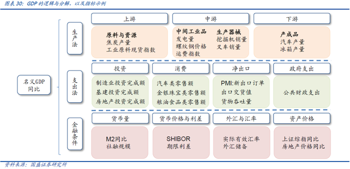 基于领先期判断与逻辑筛选后的生产法与支出法指标有工业、进出口、投资三个大类,其逻辑传导链条也有差别: