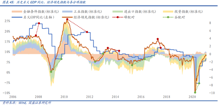 根据筛选可以得到45个领先指标,其中金融条件类指标的领先期为9个月左右,属于长领先期指标。而工业、进出口、投资领先期为3个月左右,属于中短期领先指标。
