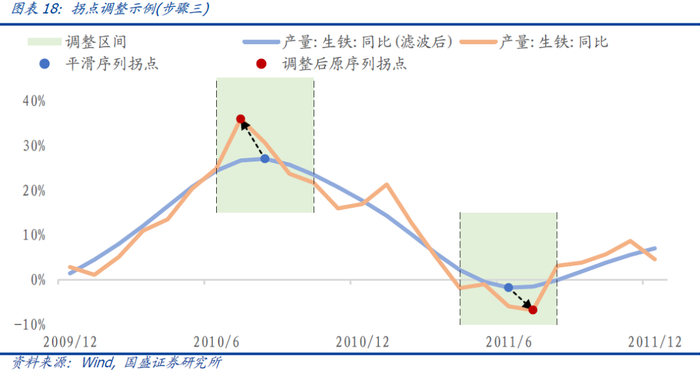 步骤三:拐点调整。在实际应用中,可能会出现平滑后数据与真实数据的拐点不一致的情况,所以需要对拐点进行调整。可在平滑后序列拐点的[-N,N]个月(本文N取4)区间内,寻找原序列或次平滑序列的最大(小)值,将其作为调整后的极大(小)值。