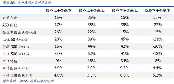 债券类在经济下+金融上区间表现最好:宽松的金融市场往往利率水平较低,同时当经济下行压力较大时央行进一步降息来刺激经济,使得债券类在经济下与金融上的区间表现最优。