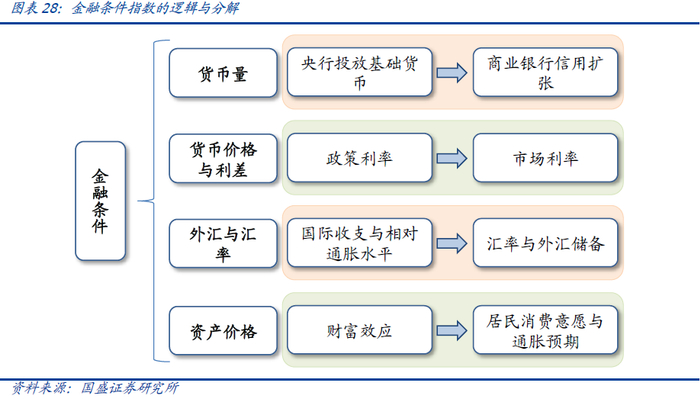由于货币政策与金融市场宽松对经济与通胀有着明显的拉动作用与领先性,本文使用金融条件大类作为刻画货币政策实施结果的观察变量,从中筛选出了部分指标构成了金融条件指数,用来衡量当前广义金融市场的松紧水平。
