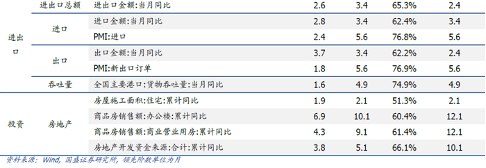 投资类指标:筛选出的均为房地产相关指标。房屋施工面积、销量、开发资金的上升会促进上游建材与原材料产业的需求,提升产值与行业利润。