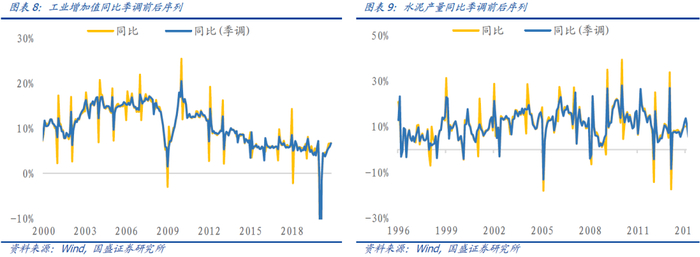 受春节效应影响的指标在1、2月份往往出现异常的噪声,影响数据的可用性,可以使用X-13模型去除。需要调整的指标主要包括消费与商品价格类、货币类、工业生产与进出口类。