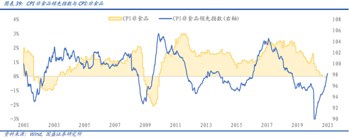 CPI:非食品包含的下游产品较多,相对来说成分较为复杂,居住、交通和通信、医疗保险的权重占比较大,且有较多的波动贡献率。目前筛选出具有领先性与相关性的指标主要为纺织行业价格指标、工业品价格指标以及投资中的房地产相关指标。最终构建出的领先指数领先期为7-8个月,时差相关系数58.1%。