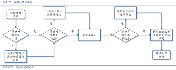 由此可以构建出适用于各种不同特征的数据处理流程,该流程将原始数据处理成去趋势与季节效应的平滑可用序列,该序列主要用于指标领先期的判断以及指标的筛选。