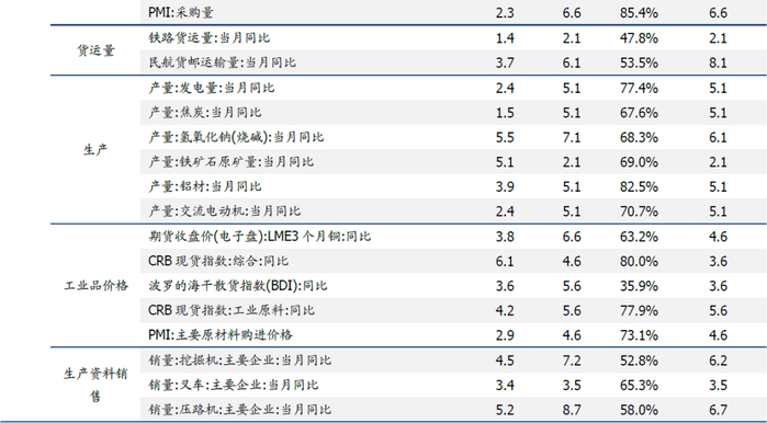 工业类指标:主要从工业总量型、工业品价格与销售、商情调查三方面因素进行刻画,总量类的指标主要有衡量总量的工业增加值与货运量。工业品价格与销售描述了工业中间品的供需情况。商情调查为反映企业活动情况的指标。