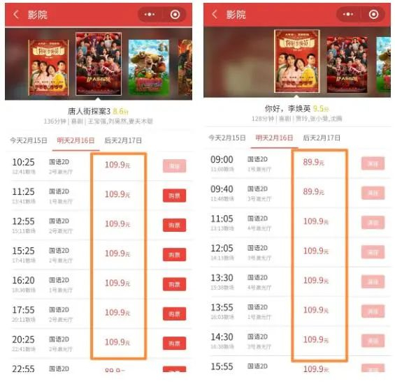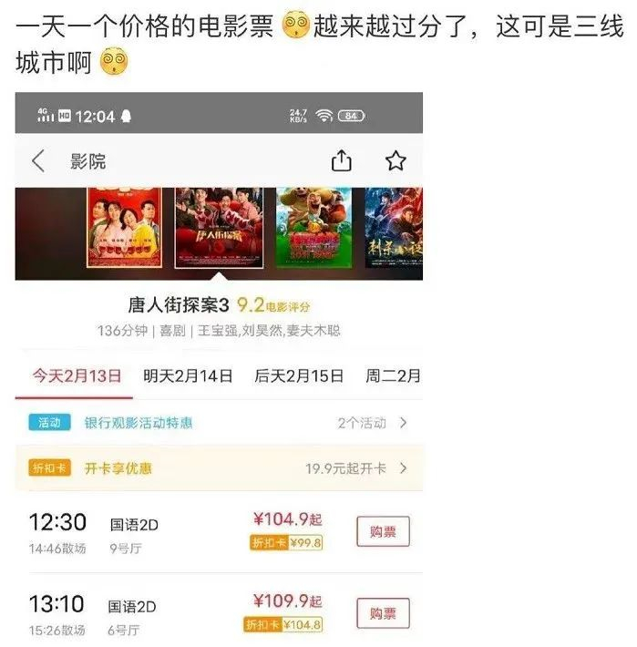 就拿最火的《唐探3》和《你好,李焕英》来说,在北京,随便一个电影院的票价都是八九十元甚至是一百多元,照平时价格直接翻倍,让人直呼“看不起”。