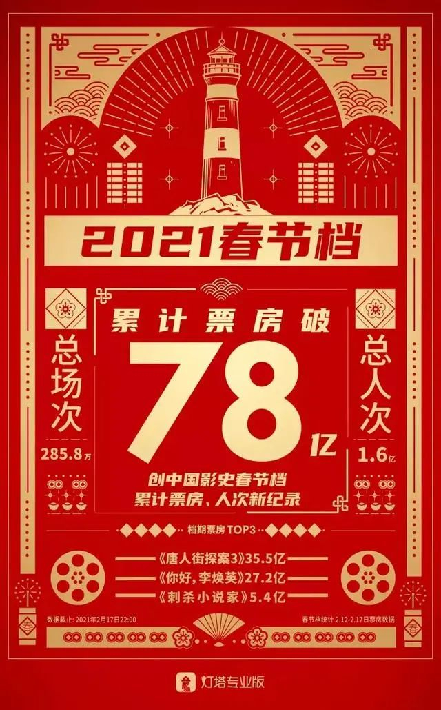 根据灯塔专业版实时数据,截至2月17日22时,2021年春节档总票房累计超78亿元,总观影人次1.6亿,累计场次285.8万,创中国影史春节档累计票房、人次新纪录。其中档期内票房排名前三为《唐探3》35.5亿、《你好,李焕英》27.2亿、《刺杀小说家》5.4亿。