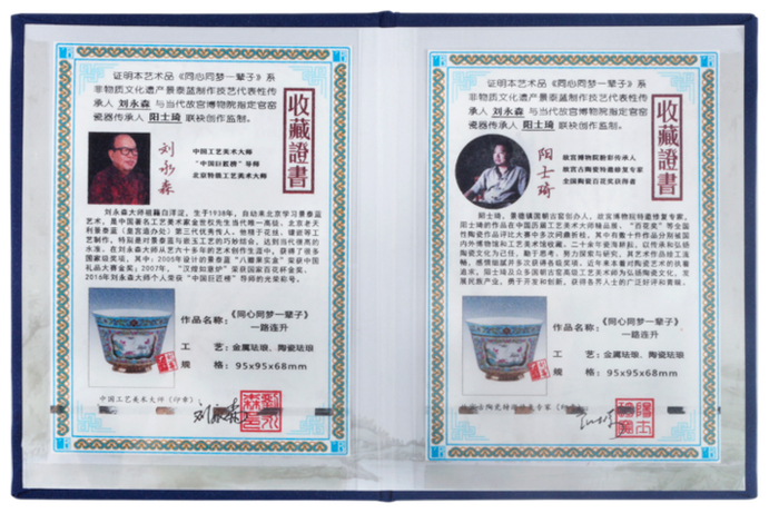 更附有两位大师签名的收藏证书和景泰蓝统一专用收藏票,正品防伪,珍藏价值颇高。