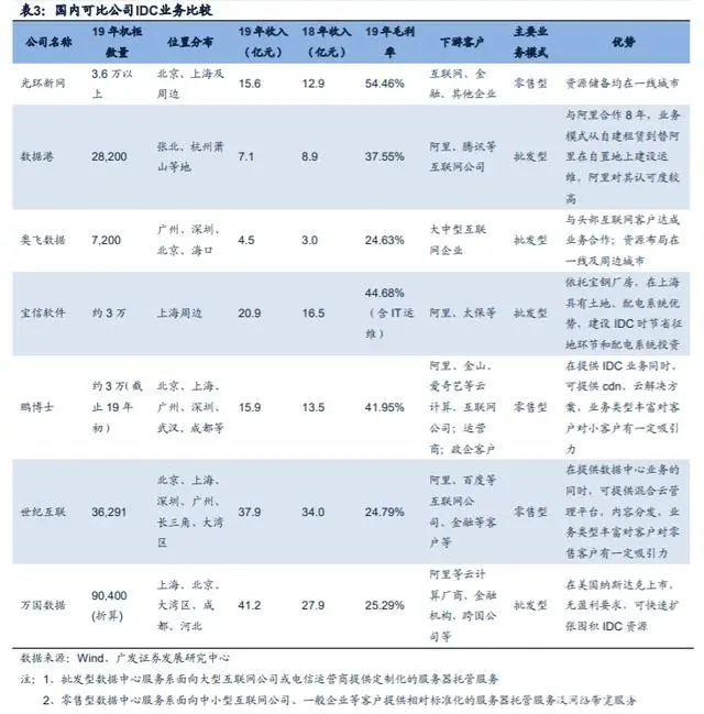 光环新网、世纪互联鹏博士、以提供零售型数据中心业务为主(零售型数据中心服务:系面向中小型互联网公司、一般企业等客户提供相对标准化的服务器托管服务及网络带宽服务)。各自特点如下: