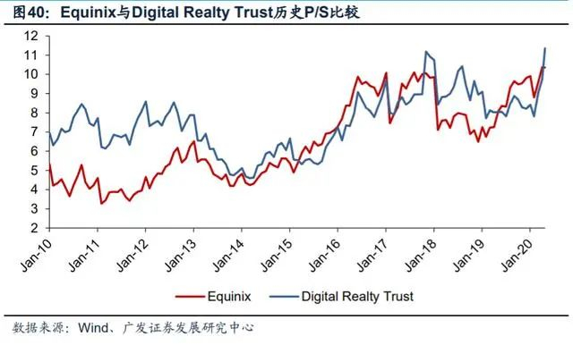 从估值水平来看,在2015年转型前,Equinix与同为行业龙头的Digital RealtyTrust相比,P/S始终略低。而在REITs转型完成后,Equinix的估值水平与DigitalRealty Trust保持相当。