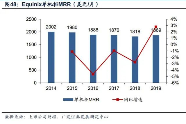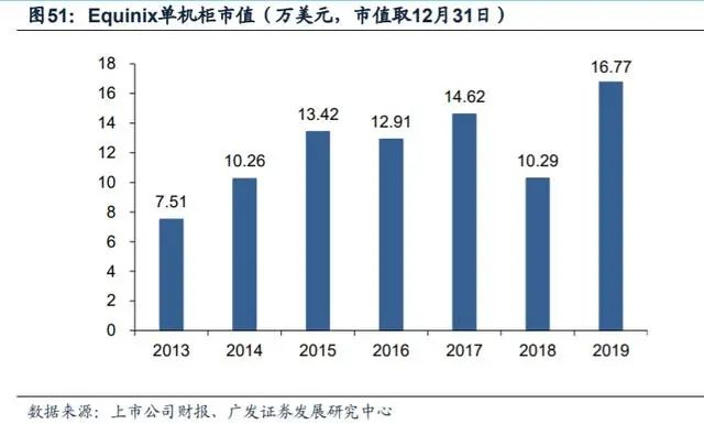 总结:从Equinix单机柜月度经常性收益情况来看,虽然整体持续下降,但降幅不大,2014-2019年仅下降6.6%,数据中心盈利能力较为稳定。随着公司规模不断增加、竞争力不断巩固,Equinix单机柜市值从13-19年是呈上升趋势的。