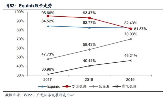 整体来看,IDC公司被赋予了相比海外Equinix更高的估值,我们认为从基本面角度可能性的原因有:一是国内的IDC行业增速更快,全球IDC行业2018年市场规模增速为18%,国内2018和2019年市场规模增速分别为30%、27%。二是上述代表性公司在未来预期有更高的增速,如万国数据18、19年实际收入增速分别为73%、48%;数据港2020和2021年wind一致预期收入增速分别为33%、54%。