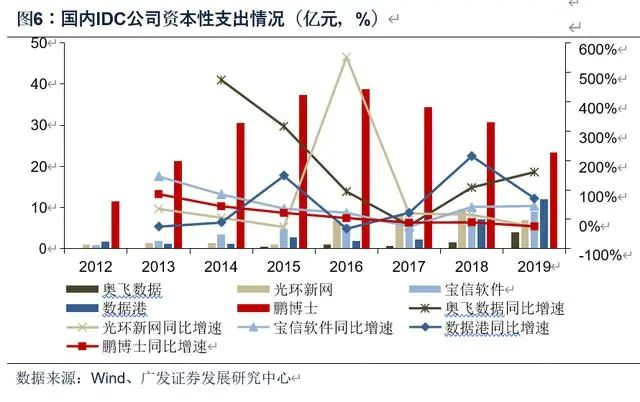 从数据上来看,国内IDC公司(固定资产+在建工程)占总资产比重大都在40%以上,数据港的比重最高,达到70%以上。其中宝信软件(固定资产+在建工程)占总资产比重在20%以下,这是由于宝信软件并非纯粹的IDC厂商,其业务除了IDC、 IT 运维这类服务外包业务,还包括信息化、自动化、智慧城市这类软件开发业务,因而资产相比其他公司较轻。IDC建设需要大量资本性支出,近几年各大公司的资本性支出整体呈上升状态,可看出各大公司为拓展业务规模,加大IDC部署力度。