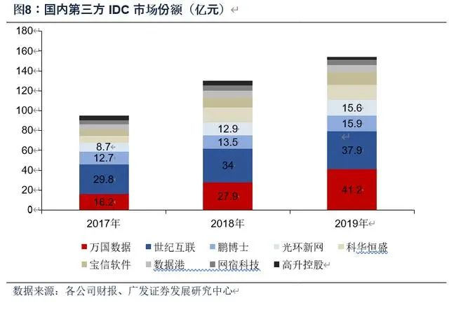 当前国内第三方IDC公司市场竞争格局较为分散。从IDC收入规模来看,2019年我们统计到上市IDC公司的收入规模合计为154亿元,万国数据、世纪互联分别排名第一、第二,收入分别13 亿元、38亿元,分别占整体规模的27%、25%(收入规模来源于各公司财报)。