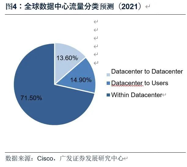 根据Cisco发布的《Global Cloud Index 2016-2021》,到2021年全球数据中心流量将达到每年20.6 ZB(1ZB=10243 GB),相较于2016年的每年6.8ZB,增加了3倍左右,2016-2021年的年复合增速高达25%,超七成的流量产生于数据中心内部, 数据中心内部进行海量数据交互,对数据中心网络性能提出挑战。