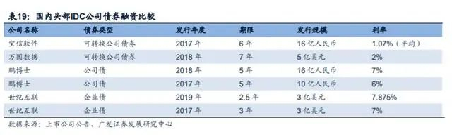 从融资成本来看,不同公司和不同融资途径存在差异。从融资途径来看,发行可转债的利率较企业债、公司债更低,银行贷款目前利率在6%,介于两者之间。从公司来看,光环新网发行可转债的利率较万国数据低1%左右,鹏博士发行债券的利率较世纪互联低0.9%左右。