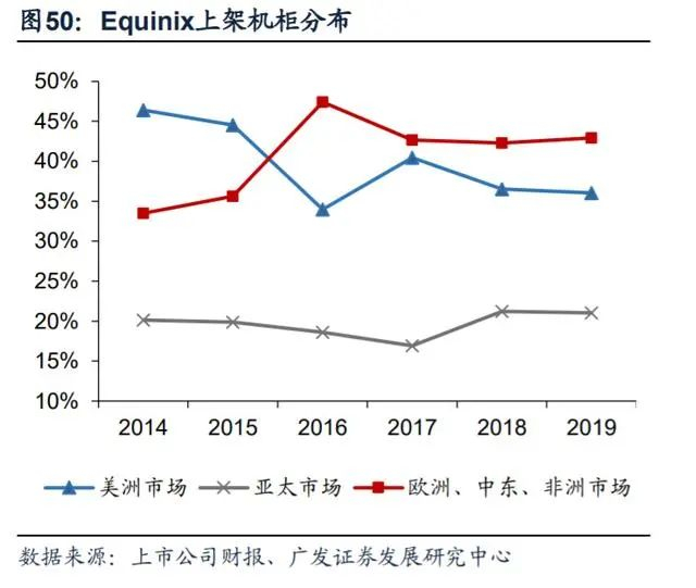 单机柜的月度平均经常性收入持续下降,但降幅不大,从2014年的2002美元下降到2019年的1869美元,2014-2016年的复合增速为-3%,2016-2018年的复合增速为-2%,降幅不大,下降原因分析:从市场分布来看,三大市场中盈利能力最强的美洲市场在2014年上架机柜数占总上架机柜比例为47%,而到了2018年这一比例降至37%;从单个市场盈利能力来看,美洲市场较为稳定,欧洲、中东、非洲市场单机柜MRR从2014年的1597美元/月降至2018年的1352美元/月,亚太市场单机柜MRR从2014年的1883美元/月降至2018年的1762美元/月(变动幅度相对较小)。但欧洲、中东、非洲市场和亚太市场盈利能力在2019年有所提升,因此整体MRR在2019年有所回升。