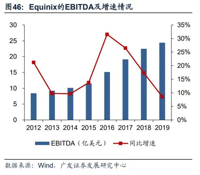 由于转型REITs带来募集渠道的拓宽,使得Equinix的并购计划获得充裕的资金支持,从而实现业务规模拓展。营业收入自2015年实现较大提升,2013-2015年,营业收入复合增速为13%;2015-2018年,营业收入复合增速为23%。EBITDA变化趋势与收入相近,2013-2015年,EBITDA复合增速为11%;2015-2018年,EBITDA复合增速为25%。