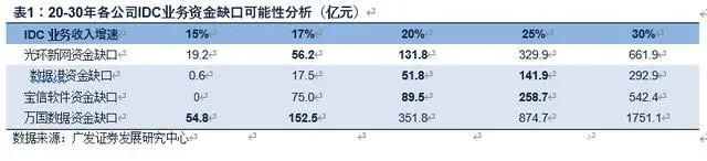 根据对光环新网、数据港、宝信软件、万国数据四家公司2020至2030年IDC建设的资金缺口的测算结果,当光环新网IDC业务收入增速保持在15%-20%,资金缺口为19-132亿元;当数据港IDC业务收入增速保持在20%-25%,资金缺口在52-142亿元左右;当万国数据IDC业务收入增速在15%-17%,资金缺口在55-152.5亿元左右;当宝信软件IDC业务收入增速为20%-25%,IDC业务资金缺口为89.5-258.7亿元,预计宝信软件开发业务未来可以产生经营性现金流114.8-144.7亿元,因此公司资金缺口为0-143.9亿元。我们预估在15%-25%的增速下,IDC公司资金缺口相对较容易满足,预计2020至2030年上述公司的整体年复合增速落在这一区间的概率较大。