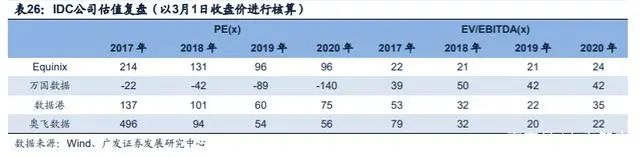 国内业务较纯的IDC公司包括万国数据、数据港、奥飞数据,我们对市场给予三家公司的估值进行了复盘,并与国外IDC龙头Equinix的估值进行对比。由于IDC属于重资产行业,固定资产折旧快速增长将对利润有较大影响,欧美等成熟市场对此类行业大都采用EV/EBITDA进行估值,且不同国家的税收政策存在差异,EV/EBITDA估值方法使得不同国家的公司估值具有一定可比性。