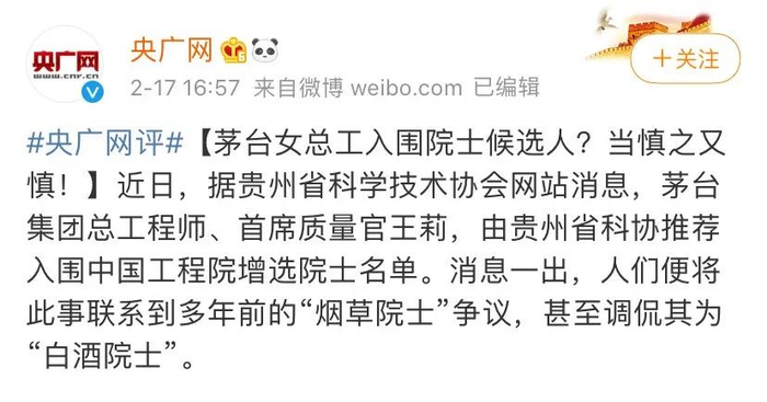 2月17日,贵州茅台在官方公众号上发布消息称,茅台集团总工程师、首席质量官王莉入围中国工程院增选院士名单。