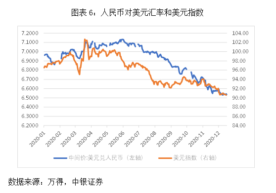 受到基本面比较优势影响,人民币汇率持续升值。2020年6月以后,我国经济领先全球从疫情冲击当中恢复过来,并且成为2020年全球唯一实现正增长的主要经济体。在基本面的支撑下,人民币汇率自5月底触及7.1316的年内高点之后开始进入升值趋势,至12月中旬人民币对美元升值幅度已超过8%。人民币升值一方面给我国带来了一个老问题,就是本币升值容易引发资本流入,抬升本币资产价格造成资产泡沫,为抑制资产泡沫货币政策被迫收紧,进而引发资本外流的循环。另一方面,我国当前出口增长较快,但出口结构依然集中在中低端产品,导致人民币汇率短期大幅升值将明显影响出口企业的利润空间。两方面因素叠加,进一步加剧了市场对货币政策收紧的担忧。