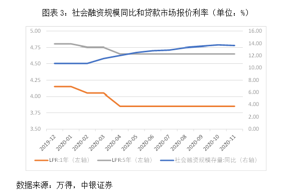 市场已经消化了此前宽松的货币政策。2020年11月,社融存量同比增速13.6%,较10月小幅下降了0.1个百分点,为年内首次出现增速下行,引发了市场对于货币政策收紧的担忧。从债券市场利率变化来看,自5月中旬以来,市场消化了此前宽松的货币政策对利率下行的影响后,债市收益率出现上行拐点。截至12月中旬,十年国债收益率回到3.2%-3.3%区间,考虑到年初货币政策引导利率下行了30BP,十年国债收益率已经基本回到了3.5%的长期中枢。