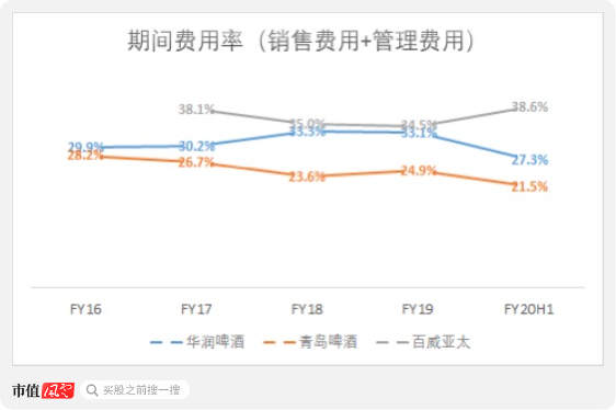 对比三家公司的期间费用率,华润啤酒2020年上半年大幅下降至27.3%,但仍然高于青岛啤酒的21.5%,不过大幅低于百威亚太的38.6%。