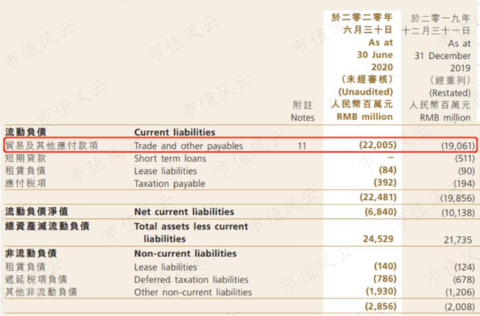 公司负债端最大的一笔是贸易及其他应付款项,截止2020年6月30日,公司账面上贸易及其他应付款项为220.1亿元,占总负债比重为86.8%。