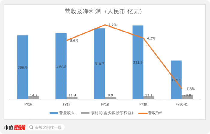 2020年上半年,公司营业收入为174.1亿元,同比下滑7.5%。