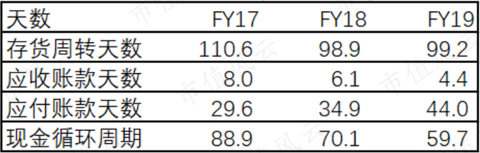 反应在现金循环周期上就是公司从2017年的88.9天大幅改善至2019年的59.7天。