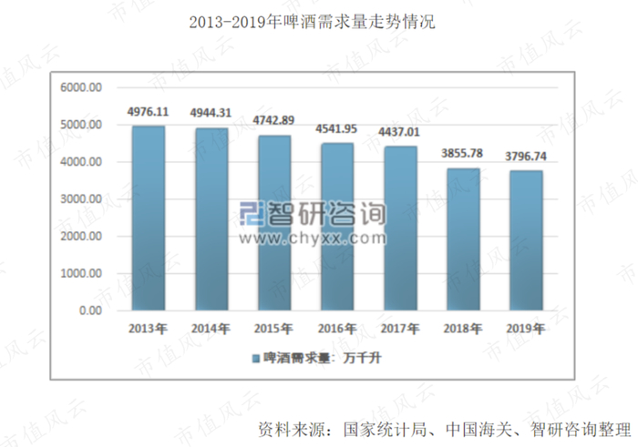 根据智研咨询的数据,我国啤酒需求量自2013年开始不断下滑,整体需求呈现疲软态势。