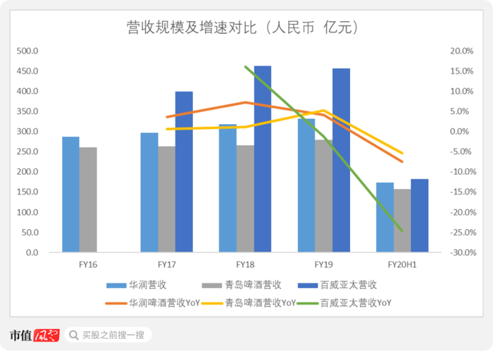 青岛啤酒的营收增速与华润啤酒颇为相似。百威亚太2018年增速高达16.1%,随后两年下滑幅度堪比坐了滑滑梯。