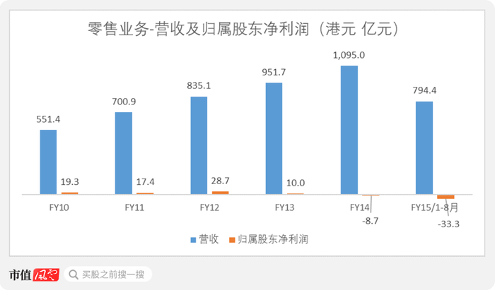 自2010年开始,公司旗下的零售业务规模逐年递增,从2010年的551.4亿港元增长至2014年的1095亿港元,几乎翻倍。
