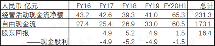 自由现金流则是从2017年便开始改善,2020年上半年达到60.5亿元。过去四年半总计实现自由现金流173.1亿元。