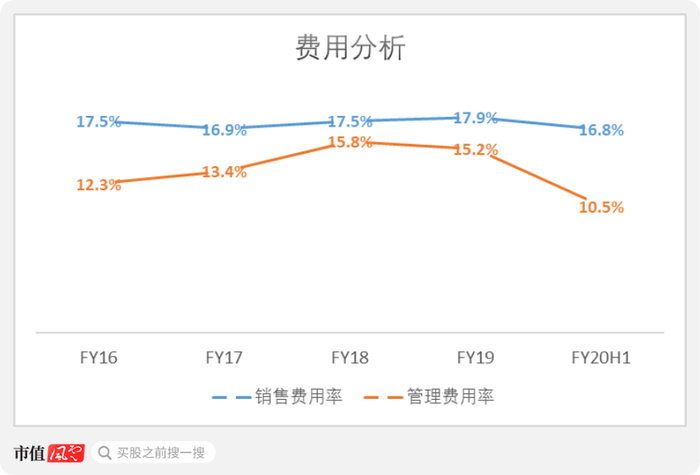 2020年上半年,管理费用率大幅下降至10.5%,相较2019年下降了4.7个百分点,同时销售费用率也略微下滑至16.8%。