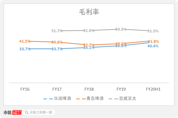 华润啤酒的毛利率从2016年的33.7%逐年抬升至2020年上半年的40.4%。
