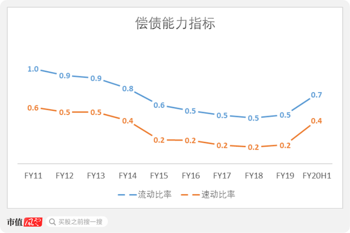 2020年上半年,速动比率和流动比率均大幅改善,分别为0.7和0.4。主要是因为相较2019年末,公司货币资金大增62.6亿元至86.0亿元。
