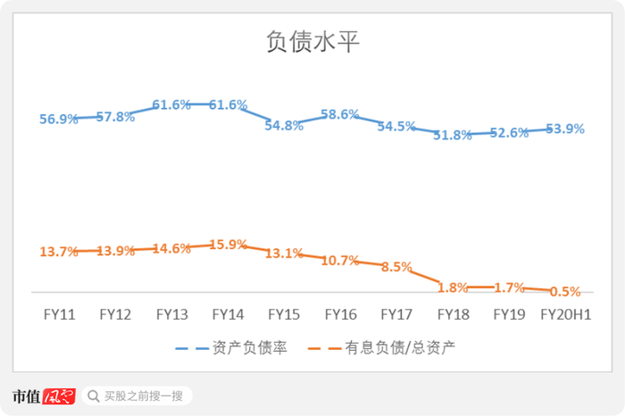 公司的资产负债率在2020年上半年略有增长至53.9%,但是有息负债却低至0.5%。