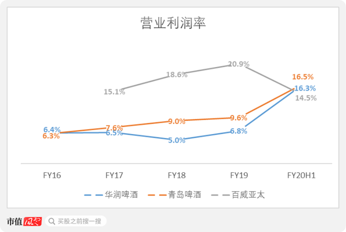 华润啤酒的营业利润率在2020年上半年急速提升至16.3%,一举超越百威亚太的14.5%,同时逼近青岛啤酒的16.5%。